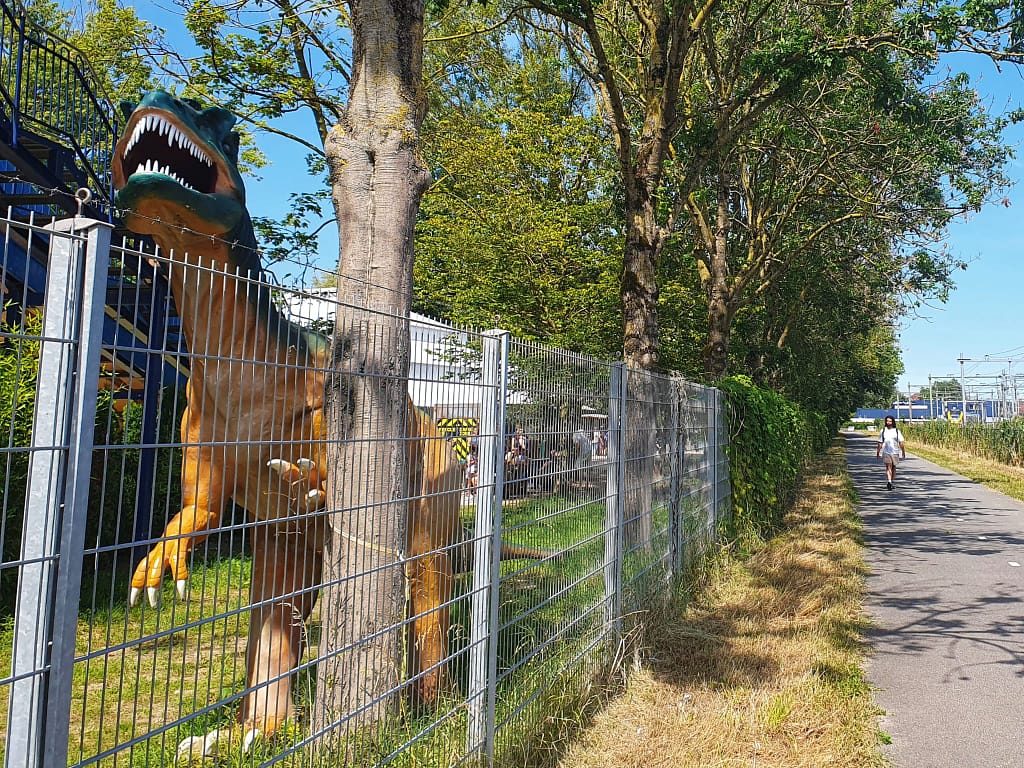 Omdat we onze limiet van drie uur inmiddels ook mentaal wel hebben bereikt en we de weg kennen, snijden we het laatste stuk af. In plaats van richting het weliswaar prachtige Katerveer te wandelen, slaan we na de overblijfselen van de oude spoorbrug rechtsaf. We wandelen een stukje door park Het Engelse Werk, langs de het enorme wiel uit een kolenmijn dat Zwolle tijdens haar 750-jarig bestaan cadeau kreeg van partnerstad Lünen. Waarna we onze weg vervolgen langs één van de dino’s van Dinoland…