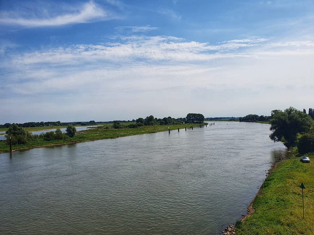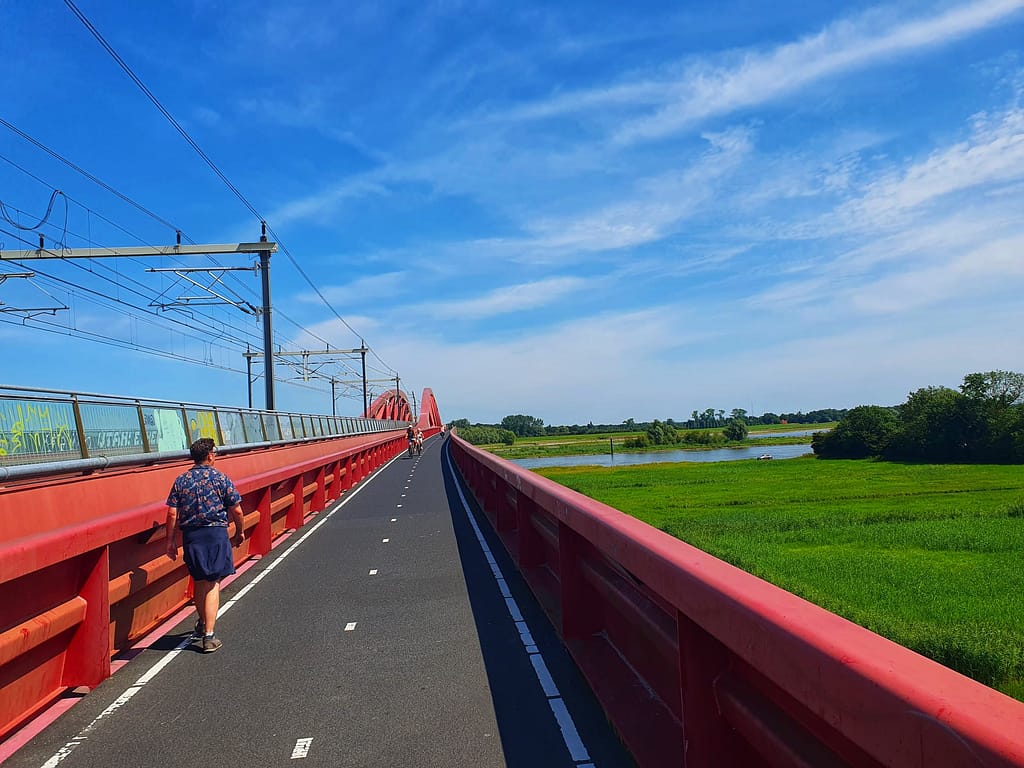Om uiteindelijk in Zwolle te kunnen eindigen, beklimmen we een trap die naar de rode Hanzeboog leidt. De spoorbrug vormt sinds 2010 één van de boegbeelden van de Overijsselse hoofdstad. Op een fietspad, afgeschermd van het spoor, wandelen we, gepasseerd door verschillende treinen, hoog boven de IJssel. Wat een uitzicht. De oude uiterwaarden staan deels onder water. Een ooievaar loopt op hoge poten door het gras, in iets drassiger gebied verderop rust een groep lepelaars, en een bootje vaart rustig over de IJssel met op de achtergrond de skyline van Hattem.