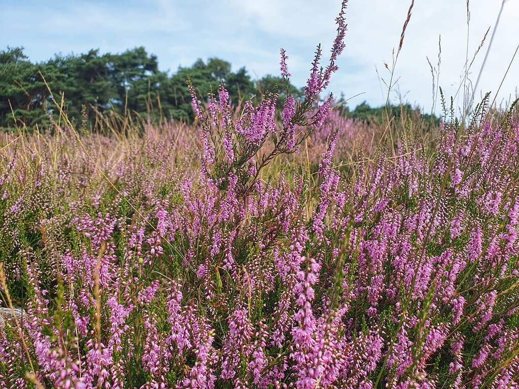Vlakbij het station in Wezep, start je (op het Vitens-terrein) direct op de paarse velden. Ietsje flets lijkt ons, als we op de zandpaden ertussendoor wandelen. Maar dat blijkt gezichtsbedrog. Want als de zon erop schijnt, krijgt de omgeving een prachtige, paarse gloed. Het is qua heide ook meteen alles wat deze wandeling voor ons in petto heeft. Maar gelukkig wacht er meer moois.