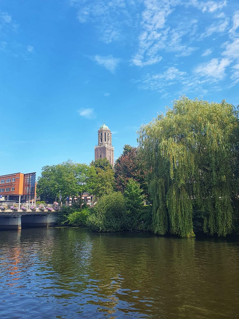 Loop jij ook deze wandeling en wil je weer naar huis? Sla dan bij het tunneltje… rechtsaf richting het station van Zwolle. Wij lopen links het fietspad op, richting het centrum. De toren van de Onze Lieve Vrouwe-Kerk verwelkomend in de verte. Er is geen heide in de Zwolse binnenstad, maar de door-Zwollenaren-liefkozend-Peperbus-genoemde toren is ook een plaatje. Tijd om er met de voeten omhoog vanaf het terras naar te kijken.